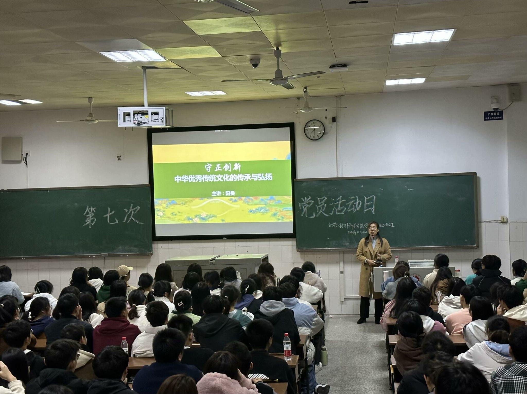 2023年11月26日晚,公司本学期第七次党员活动日讲座在行知楼601进行,公司党总支书记阳曼老师以《守正创新,中优秀传统文化的传承与弘扬》为题为全体员工党员和入党积极分子授课