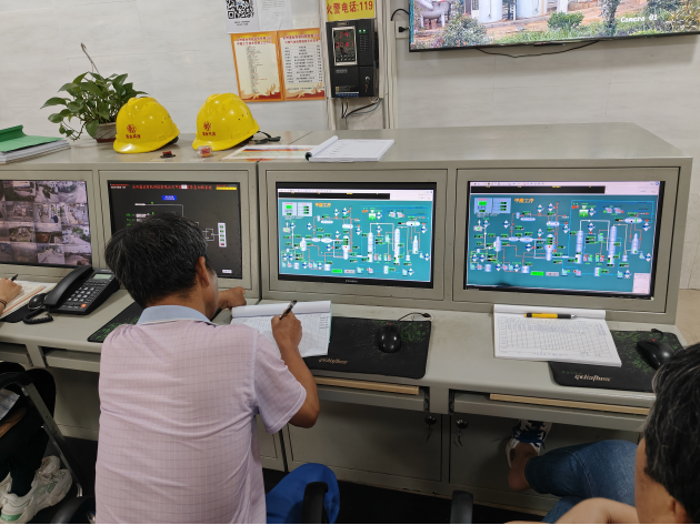 首先技术人员给我们上了安全教育课,告诫我们目前本场甲醛生产已经实现自动化,在参观过程中勿随意触碰,勿身体随意依靠以免触发生产开关。随后我们随着技术人员进入工厂,首先进入中控室(DCS)(见图一),我们看到有三位工作人员坐在电脑前,切换电脑界面,进行开关控制,流量检查,产物浓度测定。在我们观看过程中,技术人员边给我们讲解控制面板中开关阀的作用和如何控制流量。