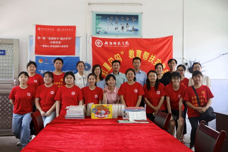 “老师,这是我们‘红星闪闪’教育帮扶实践团志愿者实践活动美好瞬间剪影以及小员工们的化学仪器美术作品。”志愿者热情地向老师们介绍他们精心准备的展板。