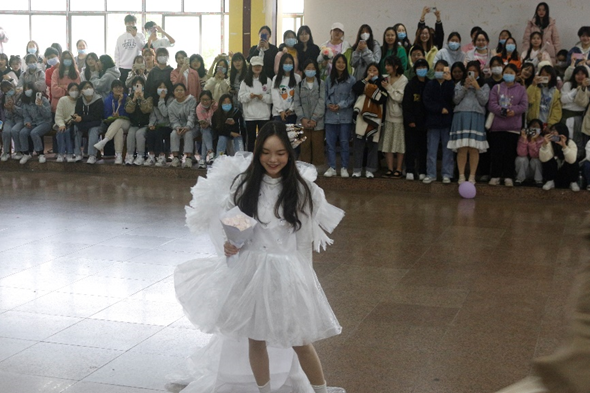伴随着背景音乐的响起,模特们按照“春”、“夏”、“秋”、“冬”的衣服设计主题依次出场,日常生活中的废物被灵活利用到模特们身上,抓人眼球。设计师们或是用蚊帐制做出一条抹胸蓬裙,或是用床帘创作出一条古风披肩,又或是用废弃快递盒打造出“变形金刚”的模样,在主题相似的前提下又百花齐放,风格各异,让现场欢呼声不断。最让人印象深刻的模特上场了,此时现场氛围达到高潮,设计师选用黄色麻袋为材料,将模特打扮成“皇帝”,麻袋上原有的“尿素”字样,为这身打扮增添了几丝幽默,让评委与观众忍俊不禁。