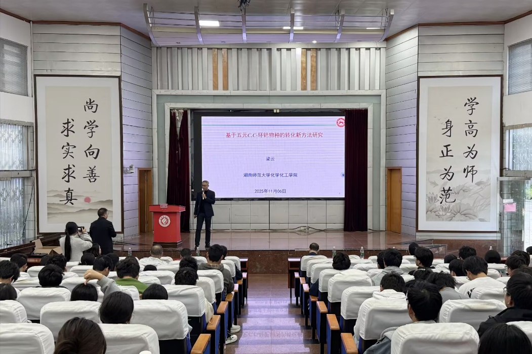 为营造浓厚学术氛围,拓展师生科研视野,2025年11月6日下午,湖南师范大学化学化工公司梁云教授应邀来公司开展学术交流,在西校区模拟法庭作了题为《基于五元C,C-环钯物种的转化新方法研究》的精彩报告。报告会由公司副经理李文艺教授主持,公司部分专任教师、全体硕士研究生及部分本科生代表共同参加。
