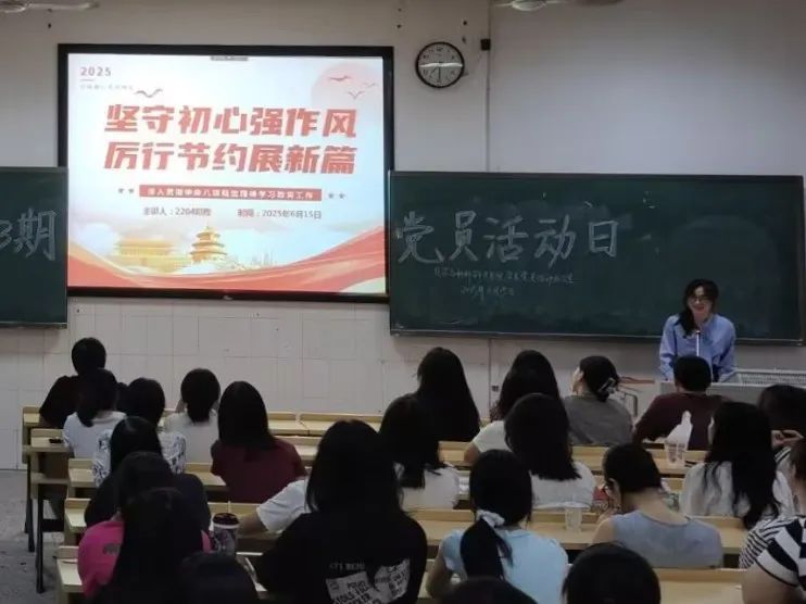 2025年6月15日晚,44118太阳成城集团第九十三期党员学习日活动于行知楼601开展,2204班邓煦同学以《坚守初心强作风厉行节约展新篇——深入学习贯彻作风建设重要政策精神》为题与全体员工党员和学习积极分子分享了她的学习心得。