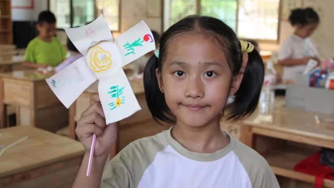 “请大家拿起手中纸杯,用剪刀把它剪成相同大小的四份。”志愿者耐心地向二年级孩子们讲解利用一次性纸杯制作小风车的步骤,孩子们目不转睛地盯着志愿者,按照“剪四瓣”“折叶片”“画图案”“穿棉签”“沾黏土”这五个步骤进行操作,直到做完一个个小风车。“老师,你看,我的风车做得最好!”一个小朋友举着手中的小风车,向志愿者开心地展示。其他年级的教室里,志愿者利用纸和快递纸盒,一边带领孩子们制作了水果团扇、纸盒小狗,一边向孩子们讲述“资源循环利用”对环境保护的意义。此外,在四、五年级的教室里也非常热闹,孩子们用蜡笔和水彩,在素描纸上就能画出一幅漂亮的简笔蜡染,一张张普通的纸,经过孩子们的勾勒、晕染创作出一幅幅充满童真的画作。