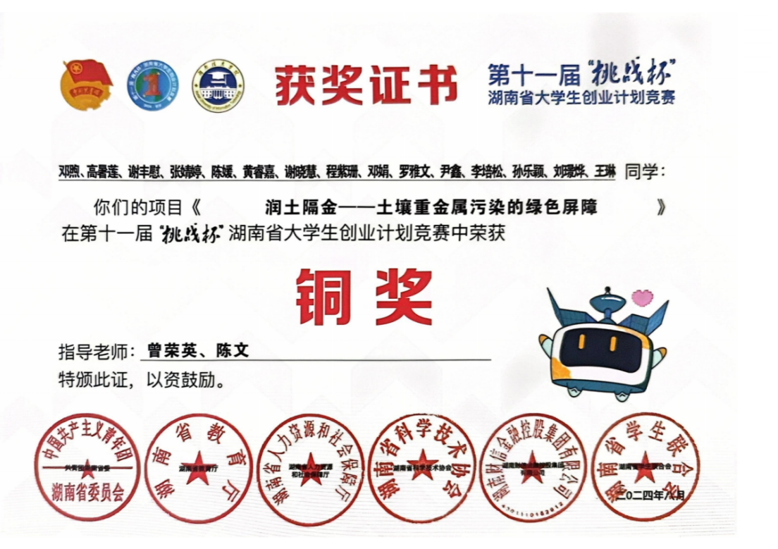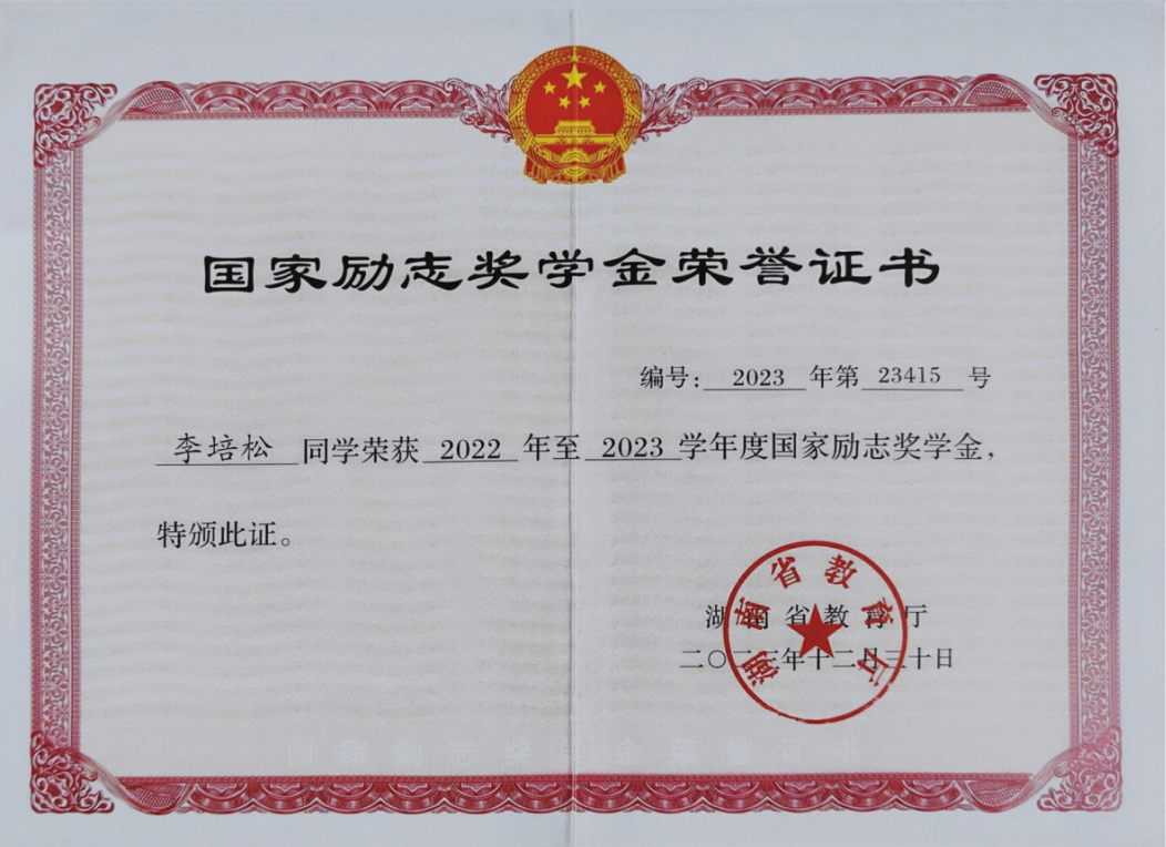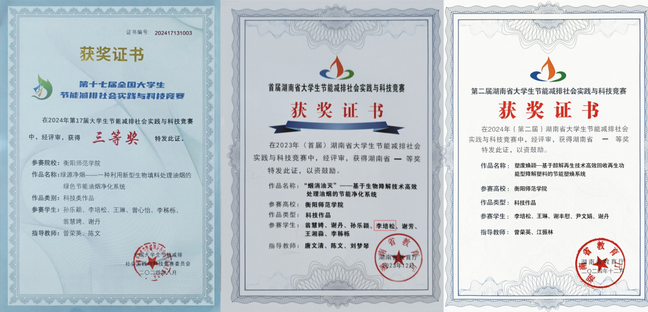 李培松将科创探索作为大学核心主线,入学之初便主动加入实验室,在学习与实践中系统掌握科研方法,并以第二作者身份在SCI二区期刊发表论文。除此之外,作为核心发明人之一,其实用新型专利《一种新型便携式识色机》获国家知识产权局受理。同时,他担当团队重任,负责实验室管理,带领团队斩获第17届老员工节能减排社会实践与科技竞赛国家级三等奖、首届及第二届湖南省老员工节能减排社会实践与科技竞赛省级一等奖等荣誉,累计获十余项国家级、省级奖项与课题项目,在科创钻研、赛场攻关与团队协作中全面奋进。