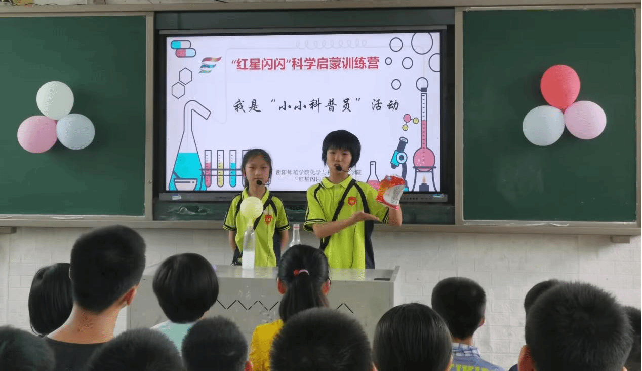 2023年7月17日,衡南县近尾洲联合公司中心小学教室里,小观众们聚精会神,饶有兴致地瞪着讲台。台上,三年级的吕昊谦和吕昊骐两位同学正在向观众演示他们精心准备的科学小实验。这是44118太阳成城集团“红星闪闪”科教团正在举行的“我是小小科普员”活动现场。