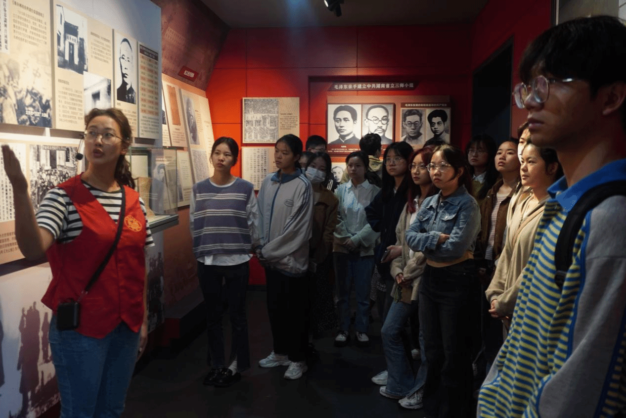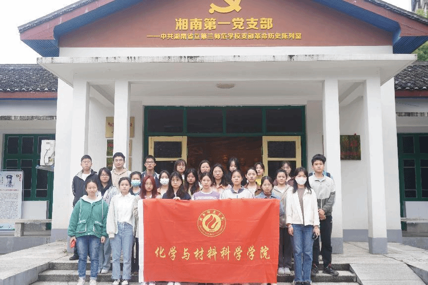 1921年10月,中国共产党诞生不久,毛泽东在夏明翰和贺恕的陪同下,到衡阳播撒革命火种,1922年4月底5月初,湘南第一党支部在湖南三师诞生,因此湖南三师被誉为“湘南革命摇篮”。在瞻仰陈列馆前的“蒋先云烈士纪念碑”后,在讲解员的带领下,同学们纷纷进入陈列馆,一同重温那段峥嵘岁月,回顾党走过的艰苦历程。三师师生中,尤为有影响力的当属张秋人和蒋先云。1922年8月,先辈张秋人以英文教师身份为掩护,在三师传播马克思主义先进思想,领导驱逐反动董事长刘志远运动,惊动全省。员工蒋先云为保护公司和师生安全组织同学们开展护校运动,阻止军阀枪兵驻校的先进事迹诠释着一名优秀共产党人的初心使命。不仅如此,夏明翰、贺恕等先辈们的爱国行动激励着我辈青年“为什么要奋斗”“该如何奋斗”。