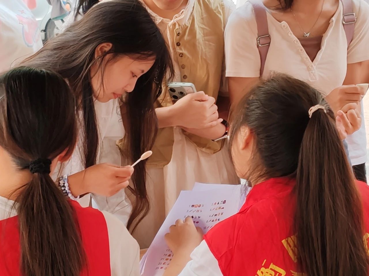 志愿者们细致地向同学们讲解游戏规则,并进行示范。在元素探索游戏中,他们耐心地引导同学们列举含有特定化学元素的物质,并提供适当的关联词提示,使同学们注意到生活中的化学现象。在正中靶心游戏中,同学们既有击中靶心的欢呼,也有擦边而过的遗憾。在emoji猜成语游戏中,同学们面对抽中的图案,或陷入沉思,或豁然开朗。到了记忆达人环节,志愿者们对社团开展的志愿服务活动进行了详细的讲解,参与者们认真聆听,仔细观察风采照上的细节。无论成功与否,他们都因观赏到那一抹志愿红而感到愉悦,并对社团产生了初步了解和浓厚兴趣,迫不及待地希望加入我们社团参与志愿服务活动。在拍照打卡环节,同学们跃跃欲试,在志愿者的鼓励下,积极参与,与易拉宝或海报的合影。随着活动的推进,各位志愿者对萤火虫志愿服务社的了解也日益加深。