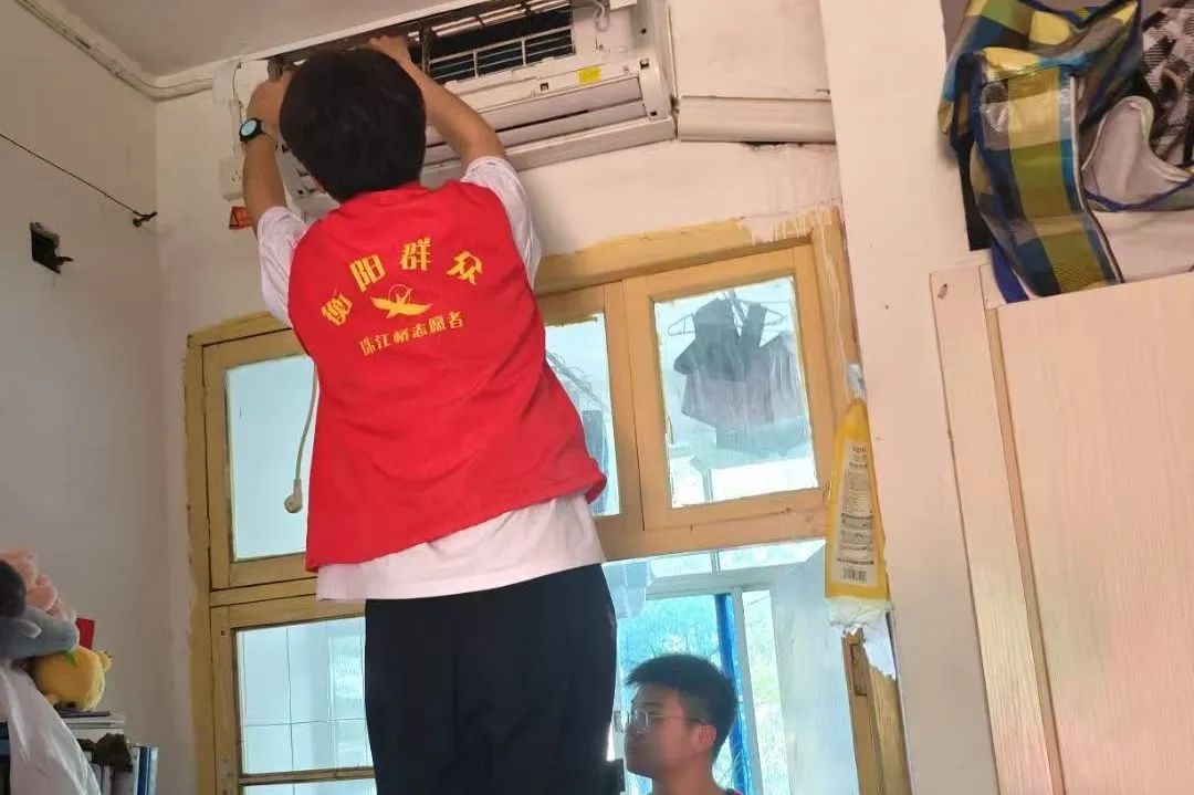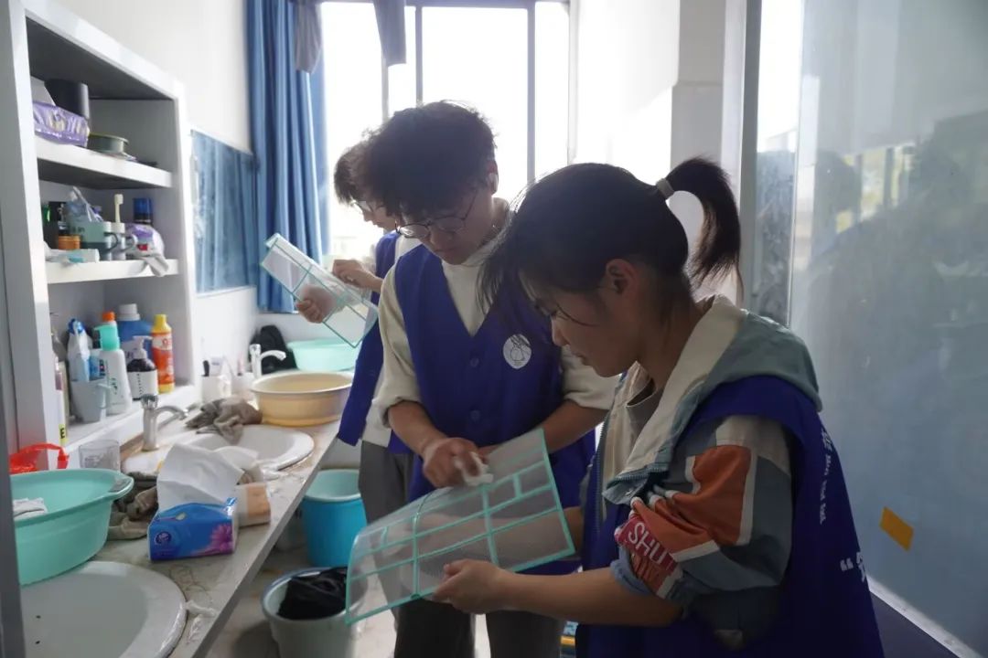 活动当天,志愿者们携带梯子、抹布、纸巾等工具,分组前往宿舍楼,细致清洗空调滤网、擦拭外壳,并向同学们讲解空调使用与保养知识。志愿者们严谨细致的工作态度和热情周到的服务,赢得了同学们的一致好评。